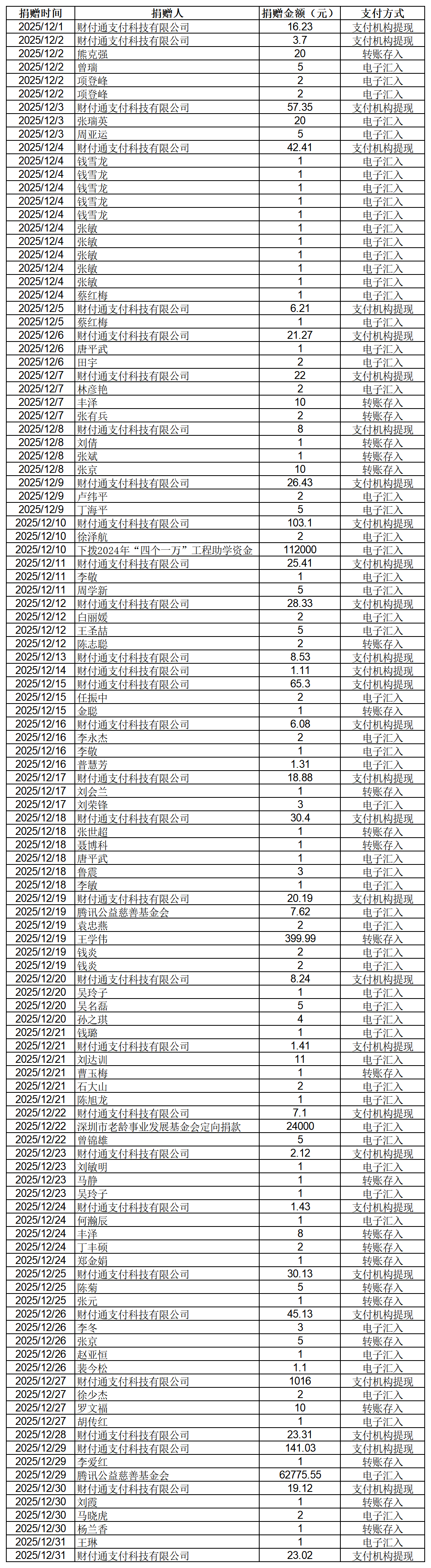 2025年張掖市慈善協(xié)會(huì)積極搭建愛心平臺,得到廣大愛心人士和愛心單位積極響應(yīng),踴躍捐款捐物,現(xiàn)將(2025年12月1日--12月31日)接收到的銀行轉(zhuǎn)賬收入公示如下: